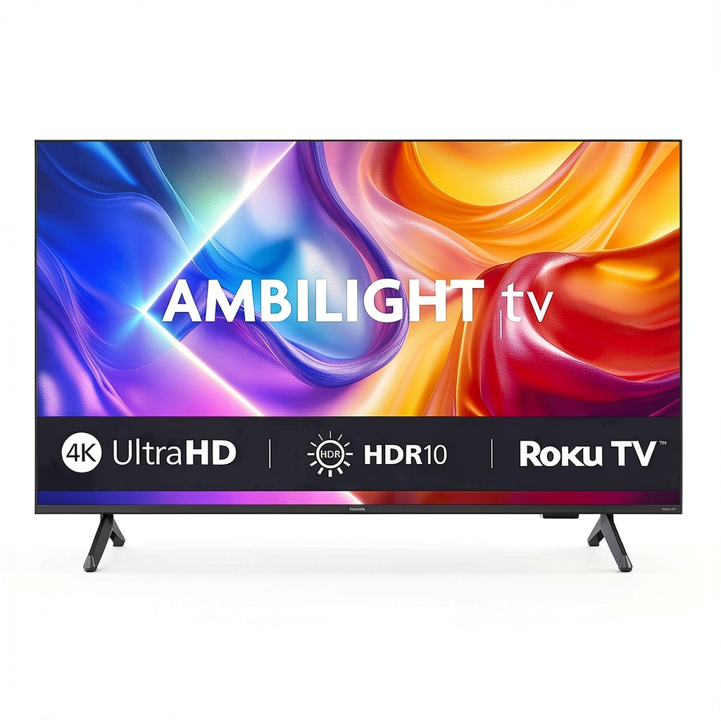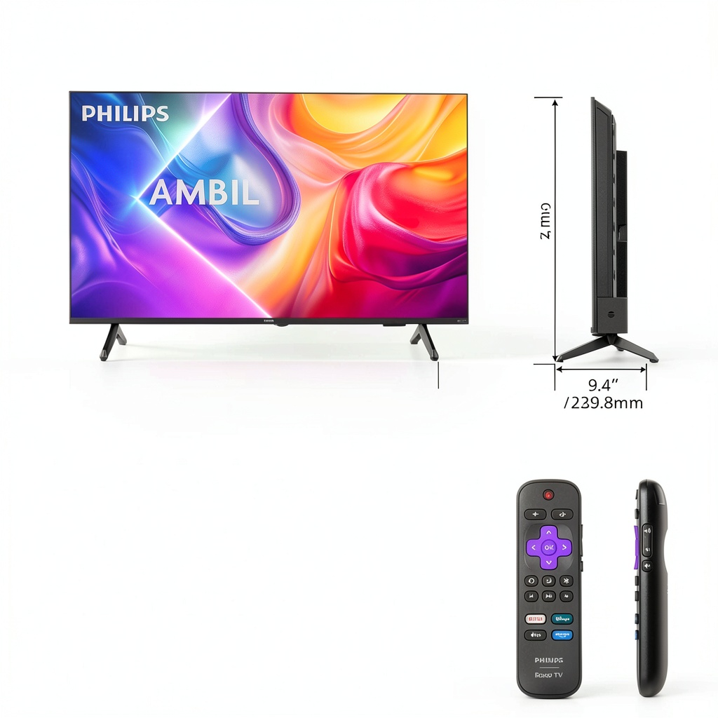 The Philips 43-inch Class 7800 Series Ambilight 4K UHD Smart Roku TV combines advanced display technology with innovative lighting to elevate your home entertainment. Featuring Ambilight, which projects dynamic LED lighting beyond the screen edges, this TV adapts to your content for a more immersive experience. With 4K Ultra HD resolution—four times sharper than Full HD—and HDR10 support, it delivers enhanced contrast, richer colors, and realistic images. The built-in Roku platform offers easy access to popular streaming apps, free movies, shows, and live TV, making it a versatile centerpiece for any living space. Designed for durability and sleek aesthetics, it includes essential connectivity options and energy-efficient performance.