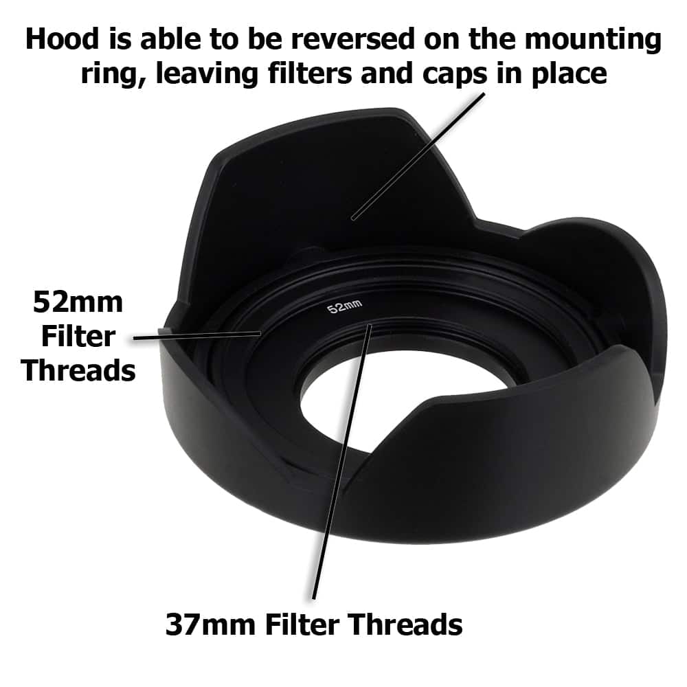 First, screw the mounting ring onto your lens threads. Then, snap the hood onto the ring until it locks securely. The hood can be reversed by detaching it and flipping it backward for storage.